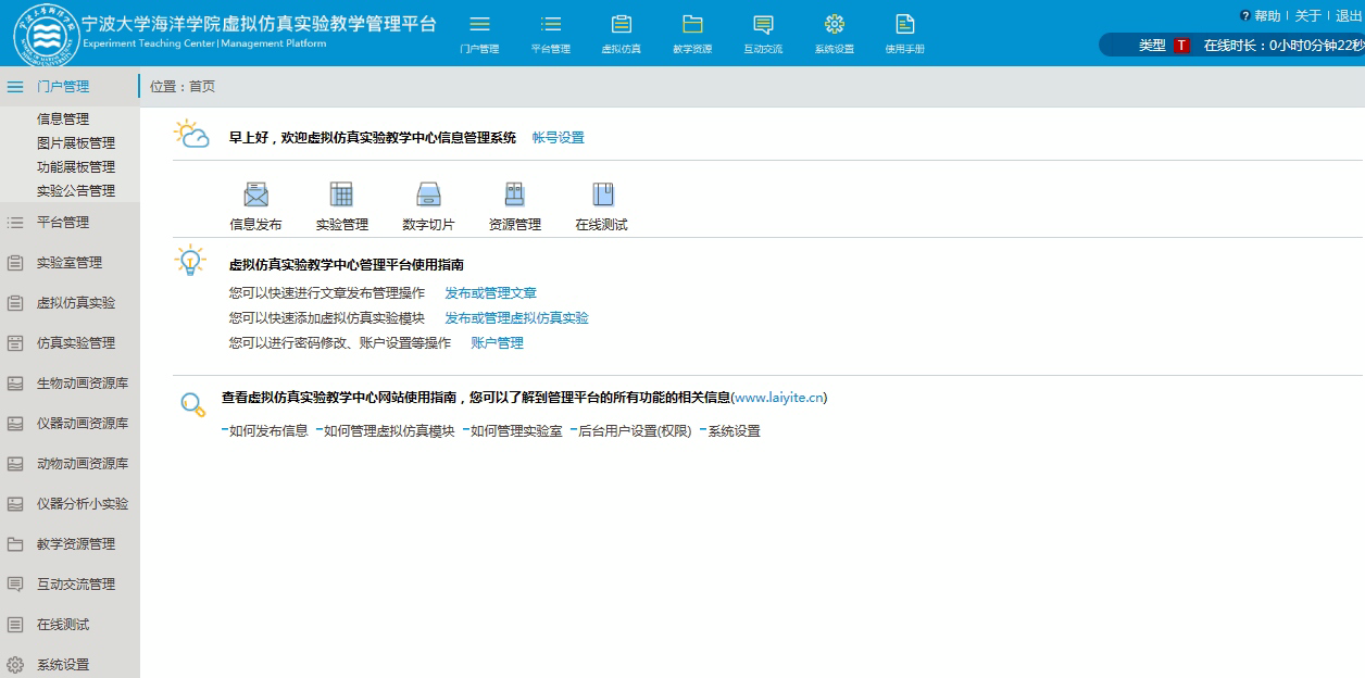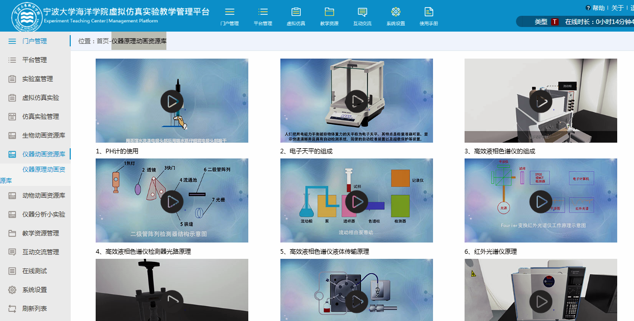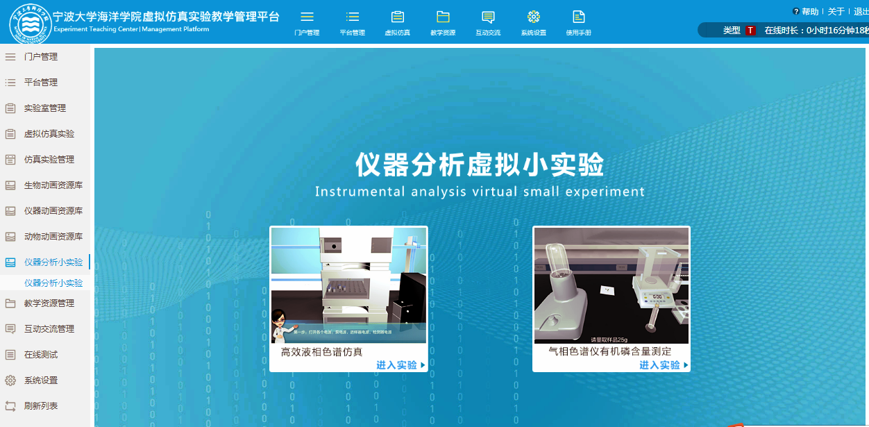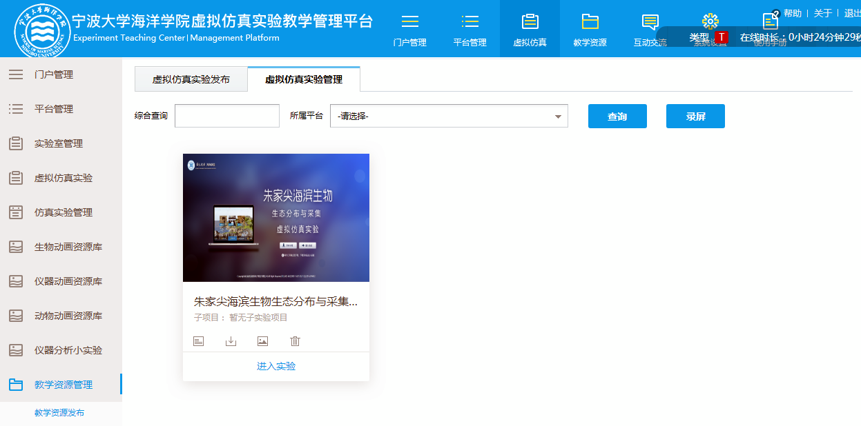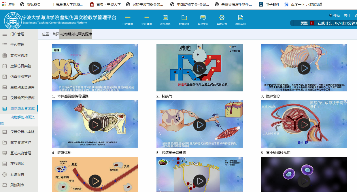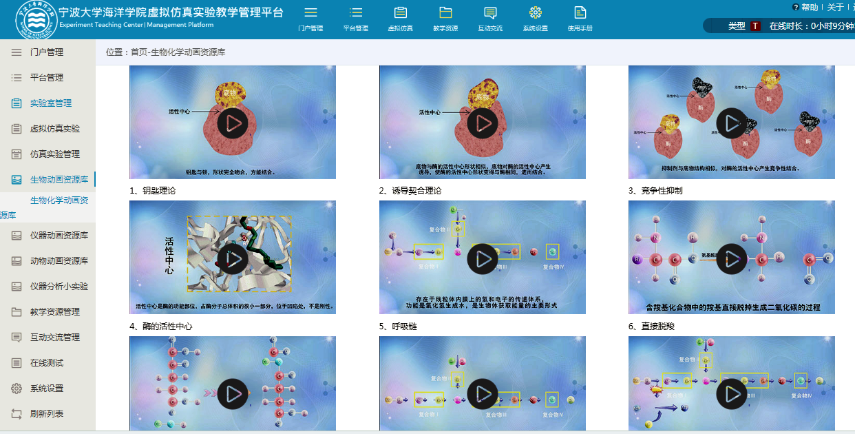 “水产养殖国家级实验教学示范中心”及虚拟仿真平台已经启用,示范中心门户网站模块包括:中心简介、申报材料、通知公告、虚拟仿真、教学资源、教研成果、教学管理、实验教学、管理制度、开放共享等栏目。虚拟仿真实验教学管理平台包括虚拟仿真实验的发布和管理;数字化教学资源管理模块;在线测试模块等。