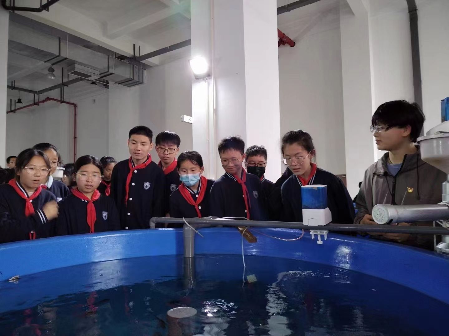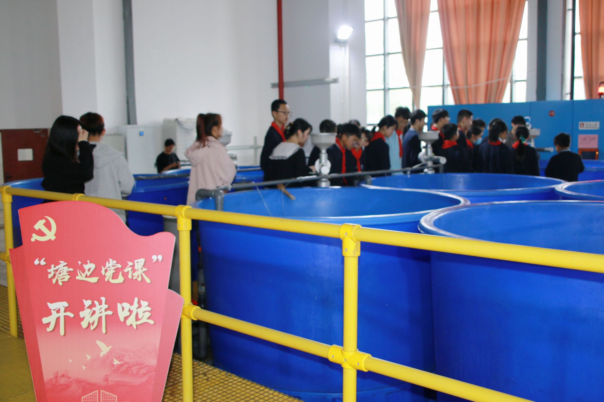 支部党员曹海庆、耿昌盛同志带领师生参观了中试养殖基地,对依托于智能化循环水系统的蟹公寓以及各种规格养殖桶进行了详细介绍,并对多米体育