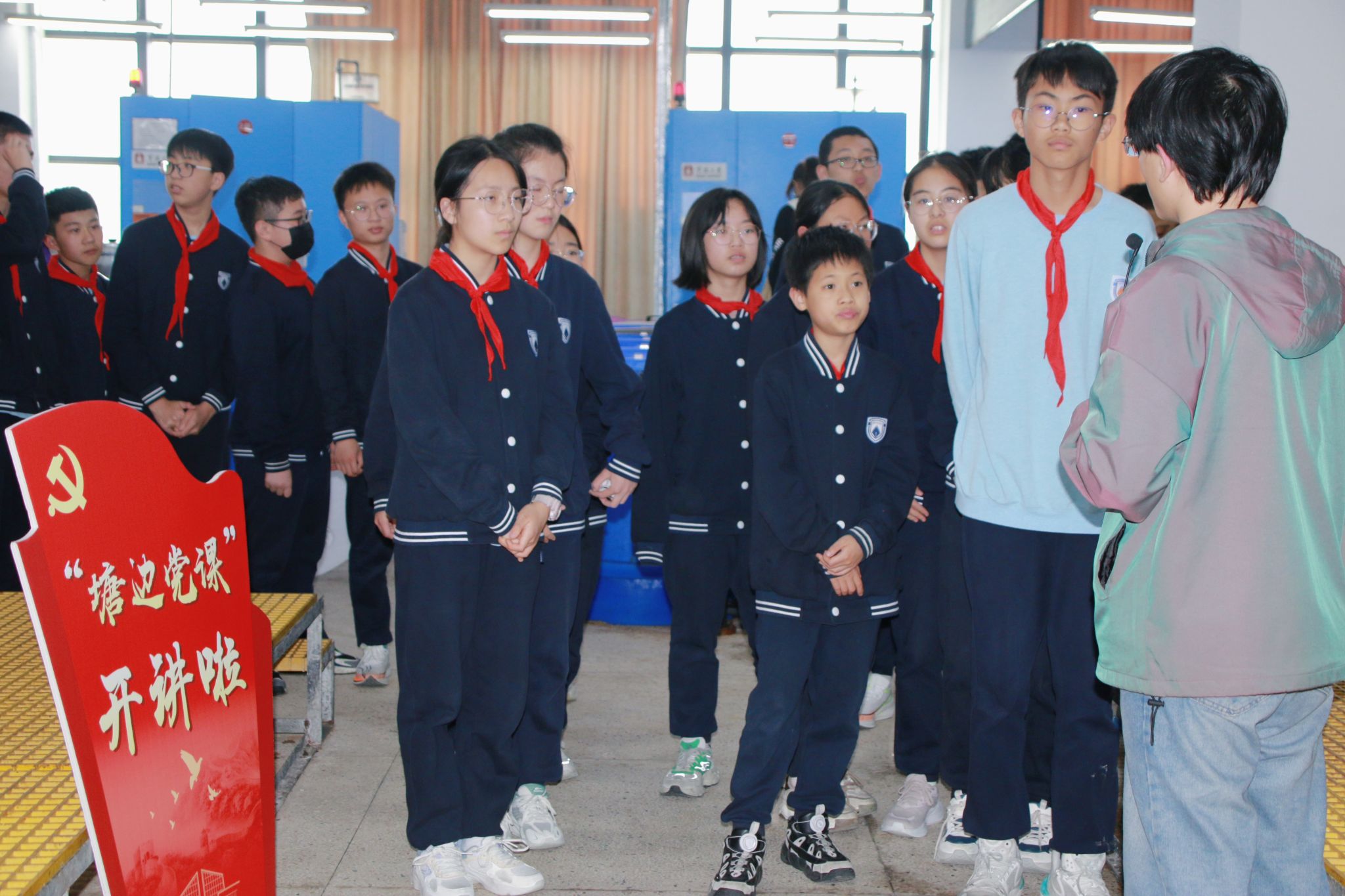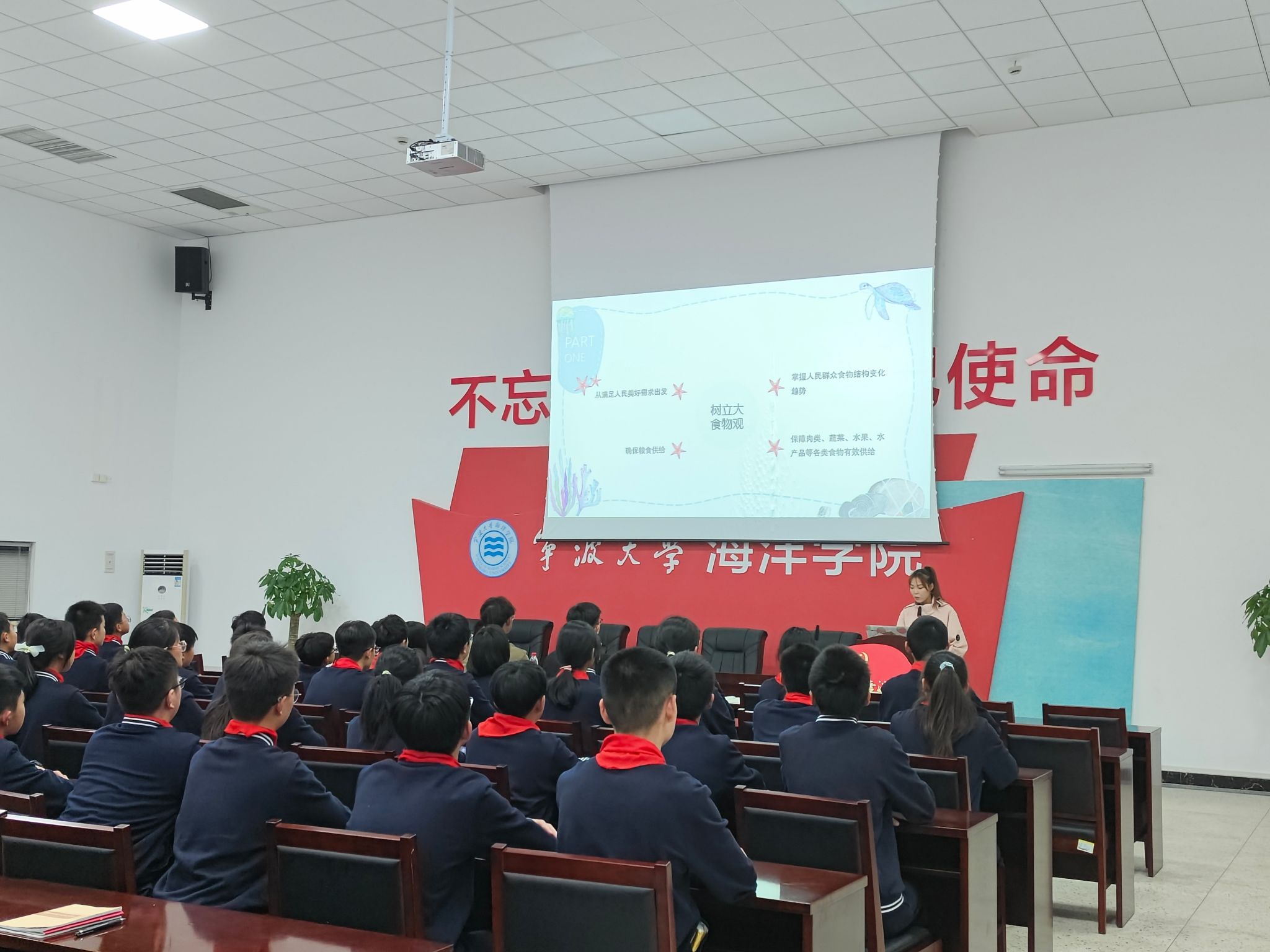 团总支书记胡炜、教师袁亦婷和七年级学生代表共计50余人受邀进校,共同开展思政理论宣讲和海洋科普活动,将理论学习与实践参访相结合,助推大中小学思政教育一体化建设。