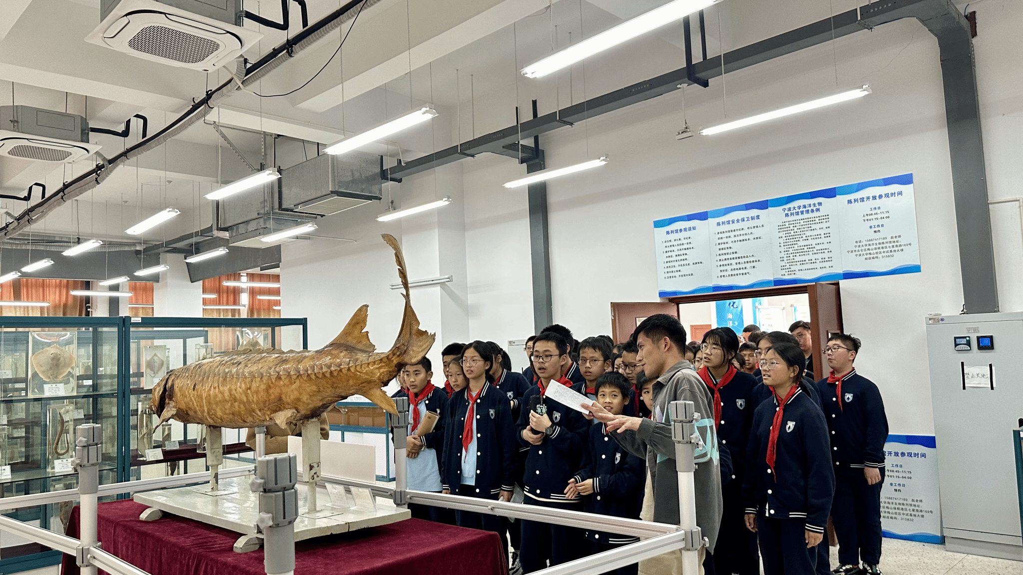 支部党员景涛、刘海萍同志向参观人员重点介绍了生物标本馆中陈列馆中重120多斤,全长两米二的“镇馆之宝”中华鲟标本的来历以及寄居蟹、银鲳、海星、珊瑚、金枪鱼和锯缘青蟹等各生物的生活习性和活动范围,并给大家介绍了多米体育
