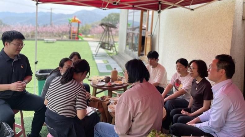 理论学习之后,支部党员们在九峰山系徒步登山,登山途中,一边聊科研,话人生;一边欣赏沿途自然风光,各色花卉以及妙趣横生的动植物。这样的运动让老师们愉悦了身心,积聚了能量。与此同时,老师们还体验了采茶、制作青团等时令农事活动,在与农户的交流中,不仅体会了农民劳作的辛苦,也感受到乡村振兴、共同富裕背景下,农村的勃勃生机。