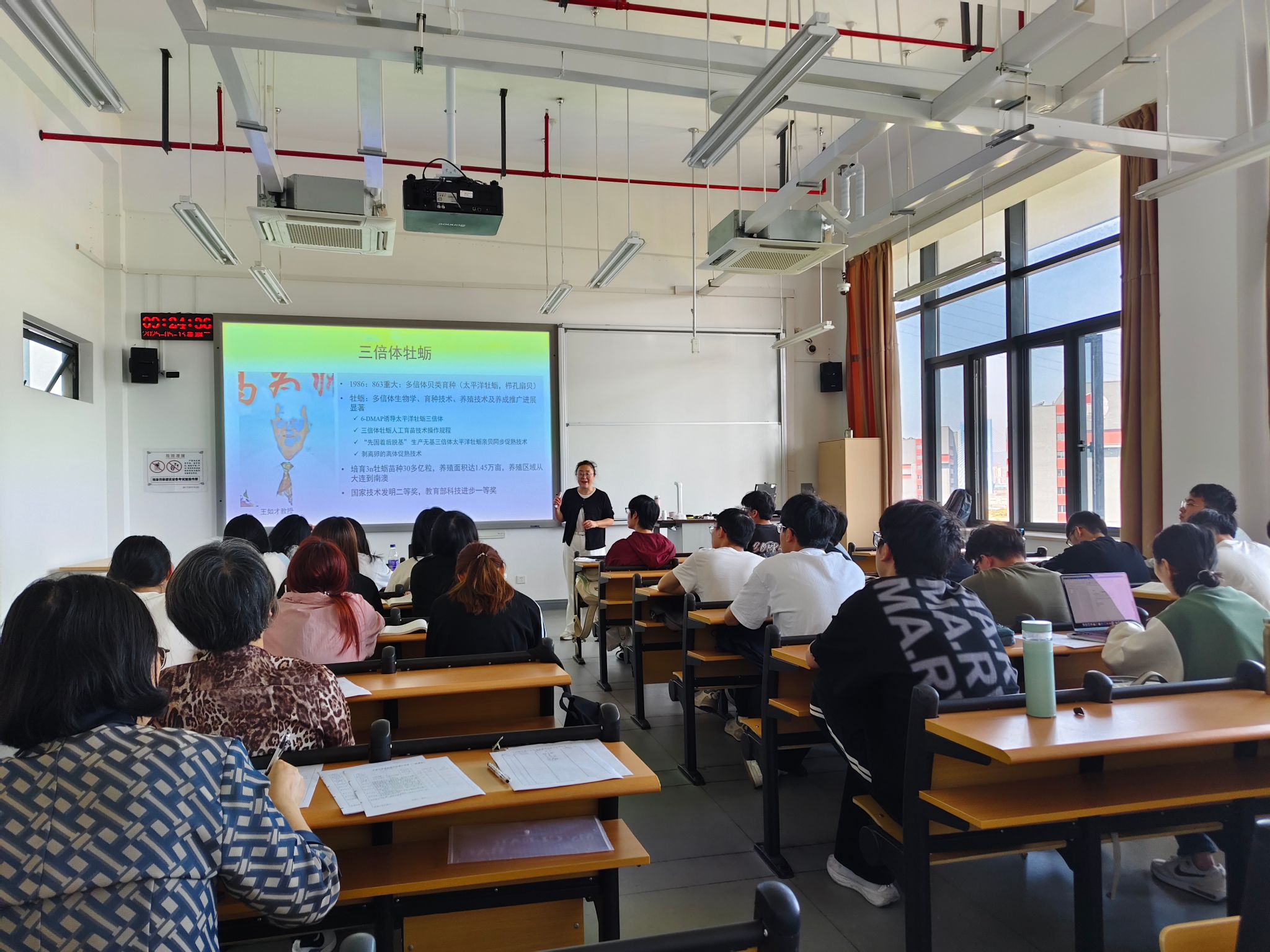 课程围绕“多倍体育种”主题展开,杨锐老师系统梳理了多倍体的生物学特性及其在水产育种中的独特优势,重点讲解了多倍体诱导的物理、化学及生物学途径,并结合人工诱导多倍体的关键技术难点与解决方案,深入浅出地阐释了多倍体育种技术的核心原理。通过范例与数据对比,学生直观理解了多倍体生物在生长性能、抗逆性及经济性状上的显著特点。