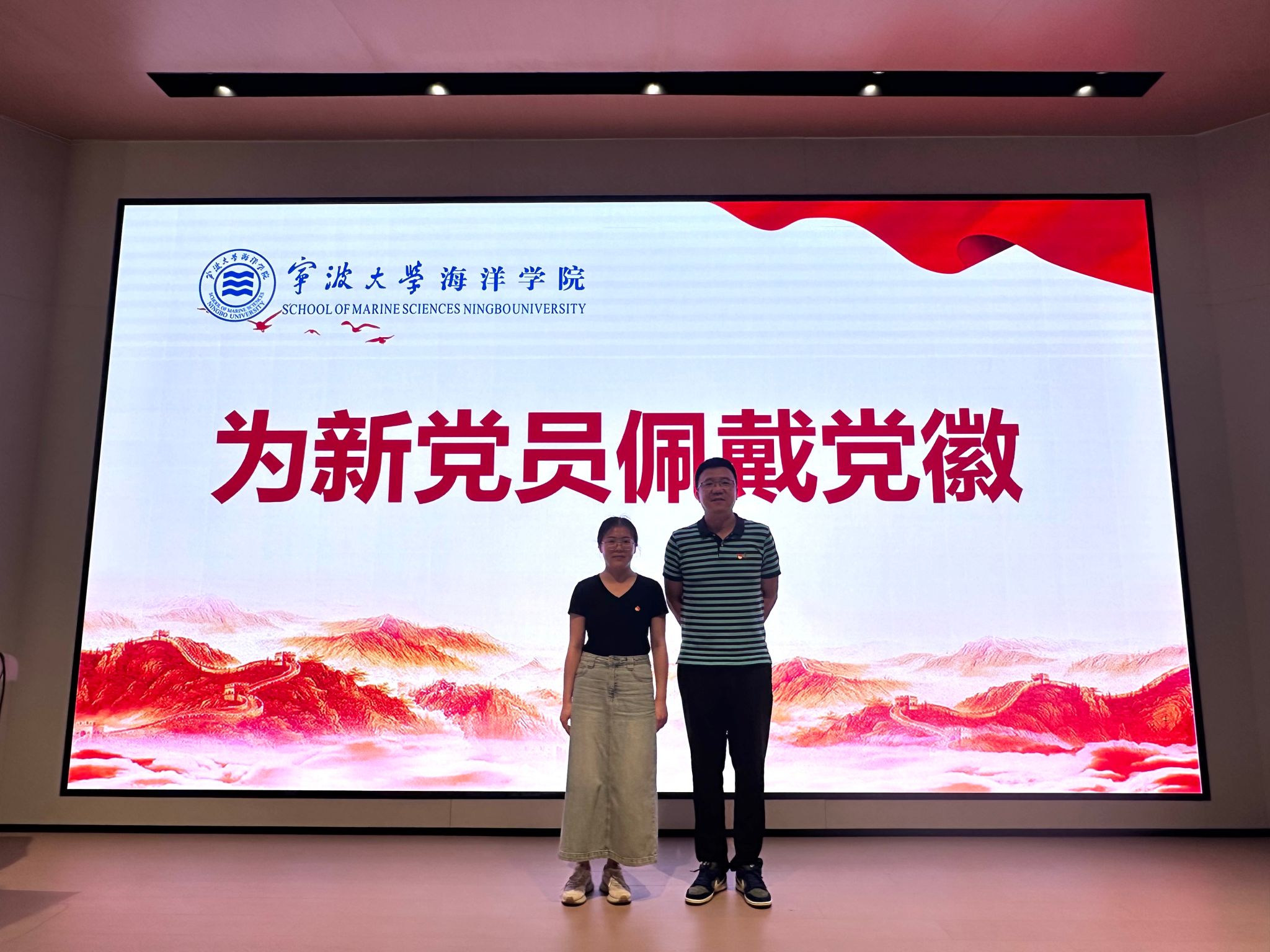 学术副院长王凯在现场为今年新发展的党员舒凤玲佩戴党徽并合照留念,不忘初心,牢记使命,一代代党员为强国事业接续奋斗的精神在这一刻得到具化。