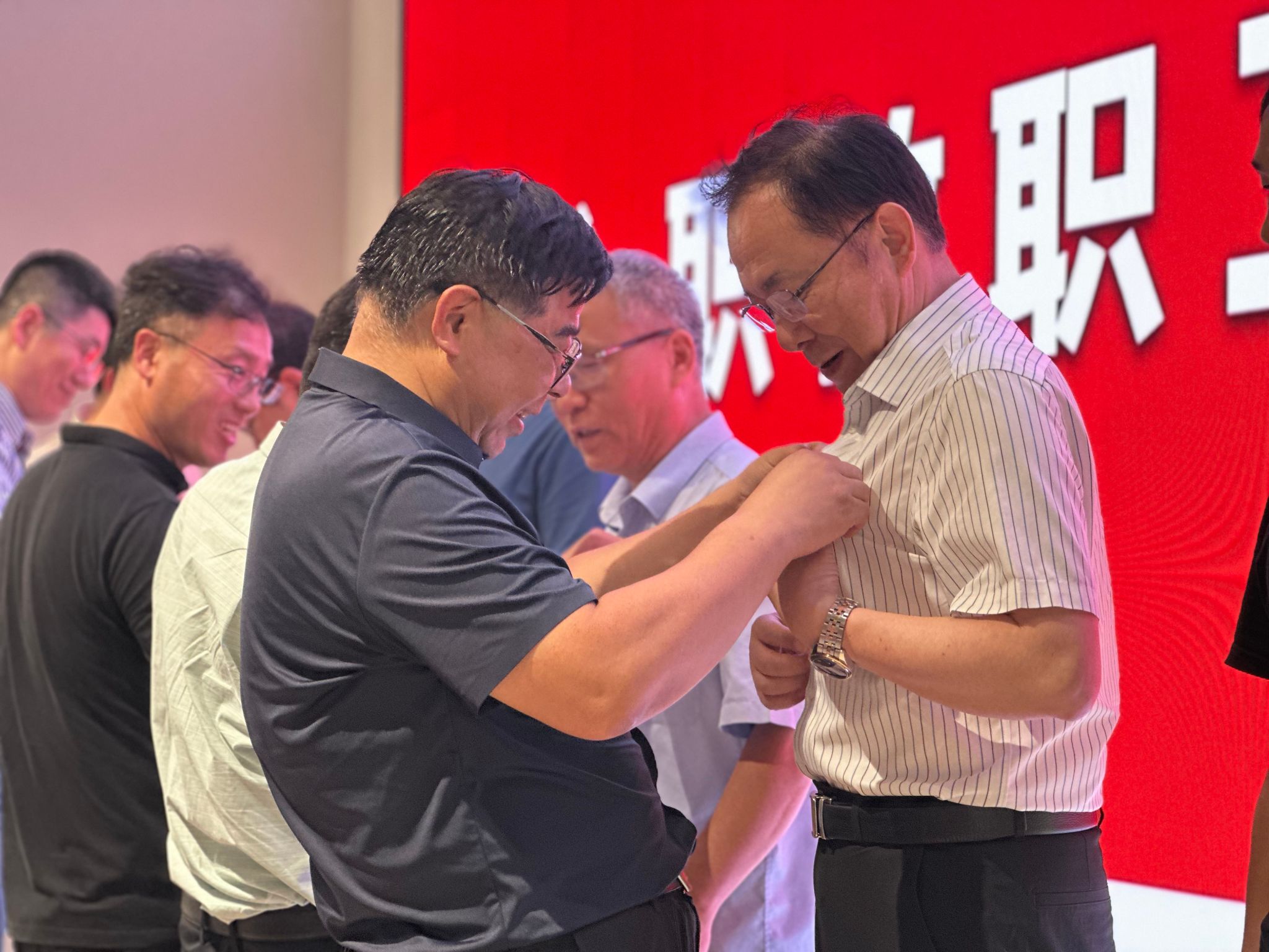 领导班子成员为他们佩戴多米体育