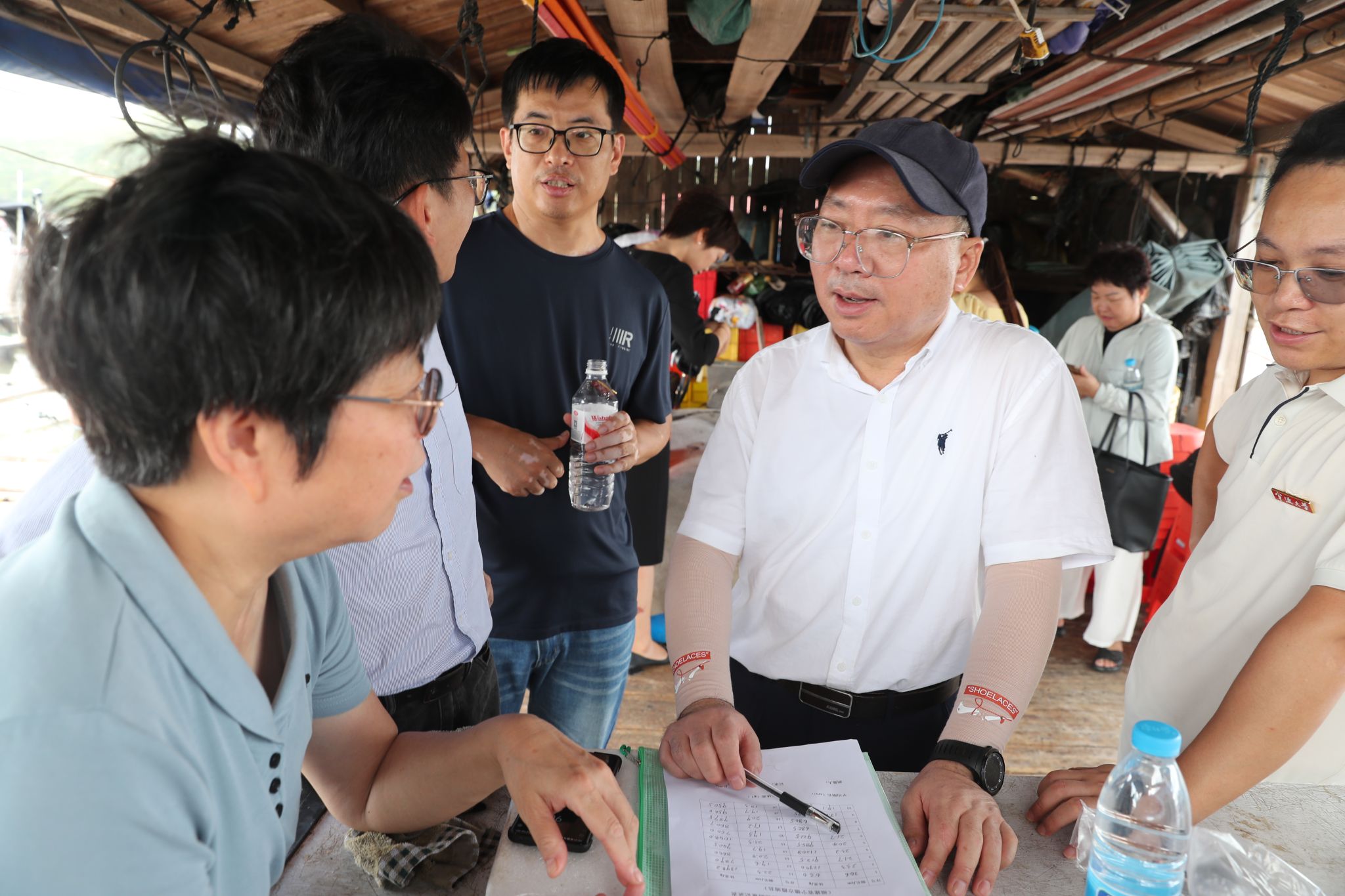 领导及项目组成员的陪同下,前往海上网箱养殖场进行现场考察。该批虎斑乌贼苗种36300尾,于5月19日投放,初始体重为5-8 g,经过四个多月的养殖,目前平均单体重量突破1000 g,存活率超过56%,远超以往的一到两成,这标志着虎斑乌贼全人工规模化育种取得关键进展,为养殖户带来显著经济效益。