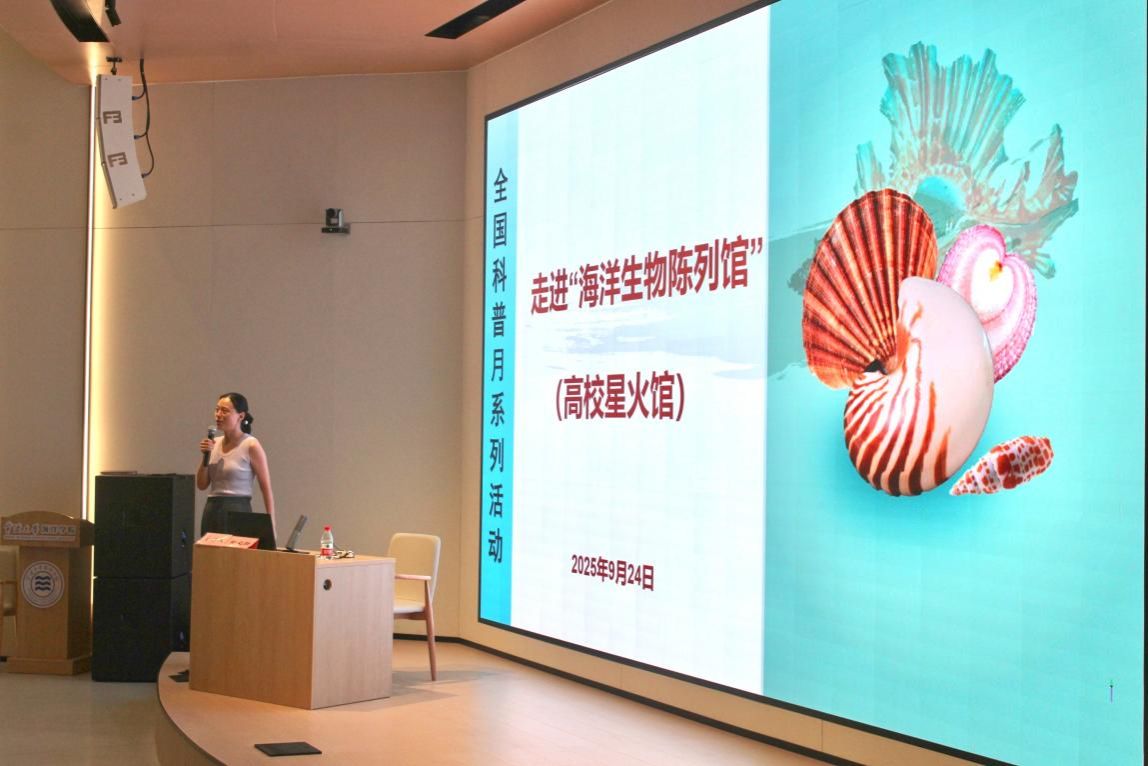 学术报告厅。海洋科普段雪梅老师以“海洋生物陈列馆”的馆藏为基础,结合贝类生物学知识,展开“神奇的贝类世界”科普课堂。科普以生动的图片和视频展示了贝类的分类、世界名贝、奇形怪状的贝类、有毒的贝类等基本知识。