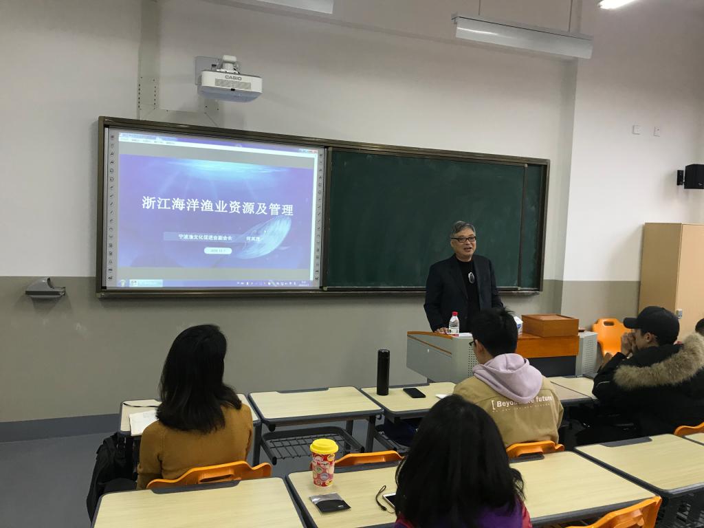 2020年12月7日上午,特邀来校讲座的宁波市渔文化促进会何其茂副会长在梅山校区李本俊楼202教室,给多米体育
