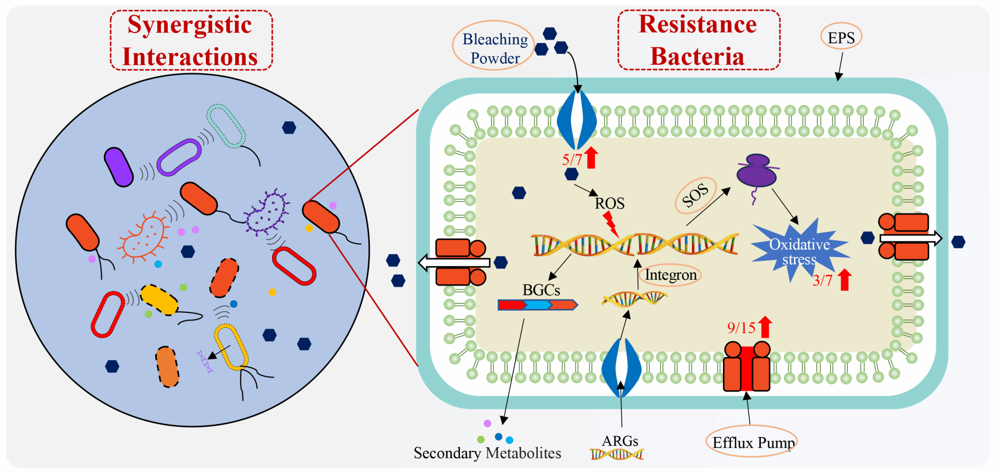 水产养殖病害频发为养殖业带来了巨大的经济损失,进行海水消毒是控制潜在病原,确保养殖顺利开展的必要措施。含氯消毒剂(如漂白粉)的消毒是水处理系统中常见的水质安全管控措施,用以控制水中的病原菌和去除抗生素耐药基因(antibiotic resistance genes, ARGs)等风险因子。在我们前期的研究中(Tang et al., Water Research, 2023),发现使用漂白粉消毒海水16 h后,微生物群落能够迅速恢复,显著降低了消毒效果;然而,导致微生物群落快速恢复的机制仍不清楚。