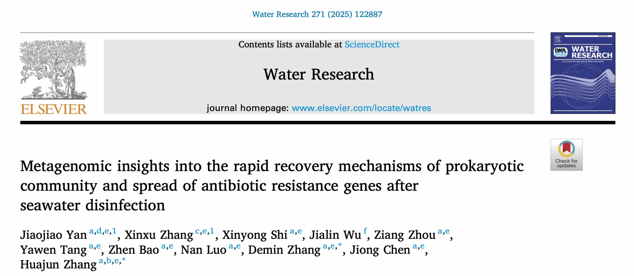 微生物与渔业健康团队张化俊副教授和张德民教授在国际著名水环境期刊《Water Research》上发表了题为“Metagenomic insights into the rapid recovery mechanisms of prokaryotic community and spread of antibiotic resistance genes after seawater disinfection”的研究论文,利用宏基因组测序技术揭示了海水消毒后原核群落恢复机制及对抗生素抗性基因传播的影响。本文是继该团队2023年在《Water Research》上发文报道漂白粉消毒后原核群落可快速恢复现象后的深入开展的机制研究。